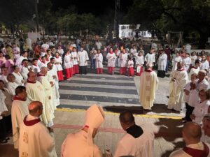Em seguida, uma fervorosa e animada procissão percorreu as ruas da cidade, conduzida pelo Crucifixo do Jubileu, símbolo central dessa celebração. Os fiéis, com cânticos e orações, caminharam em um espírito de unidade e esperança até a Catedral Nossa Senhora da Candelária, para diante da Catedral, ter a abertura solene das portas da igreja, um gesto carregado de significado espiritual.