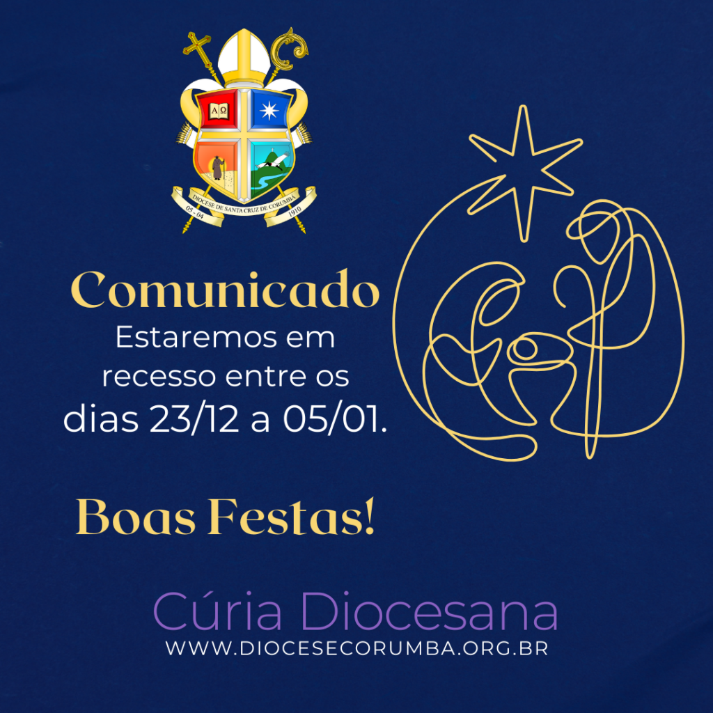 Notícias da Diocese Recesso da Cúria A Cúria Diocesana estará de Recesso para atendimento presencial entre os dias 23 de Dezembro até o dia 05 Ler mais